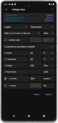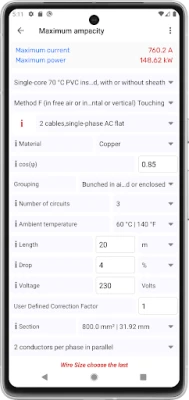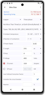 **Mobile Electrician PRO** इंडस्ट्री के मानकों, जैसे NEC, IEC, CEC, PUE, IET और AS/NZS के अनुसार तार के आकार, एम्पेसिटी और सर्किट की अधिकतम लंबाई के लिए आवश्यक उपकरण प्रदान करता है। शॉर्ट-सर्किट करंट, फ्यूज साइज़िंग, हीटिंग एलिमेंट की गणना, जनरेटर साइज़िंग, IP कोड और बिजली लागत जैसे जटिल अनुभागों के साथ यह एक अमूल्य संसाधन है। विभिन्न इकाइयों को बदलने के लिए एक मजबूत कनवर्टर भी मौजूद है। केबल से संबंधित सभी पहलुओं - जैसे पाइप में फिट होने वाली केबलों की संख्या, रील क्षमता, बिजली हानि, और वायरिंग कलर कोड्स - के लिए विशिष्ट उपकरण भी इसमें शामिल हैं।