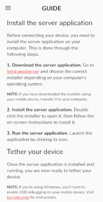 टेटर्ड एक उपयोगी और सरल उपकरण है। यह आपको अपने डिवाइस से पीसी तक और पीसी से डिवाइस तक, दोनों दिशाओं में, USB केबल के ज़रिये इंटरनेट कनेक्शन साझा करने की सुविधा देता है।